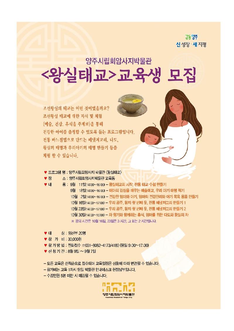 양주시립회암사지박물관은 임신과 출산, 양육의 긍정적 인식 변화를 위한 왕실태교 교육프로그램에 참여할 예비 부모와 출산예정 가정을 오는 9월 7일까지 모집한다고 밝혔다.