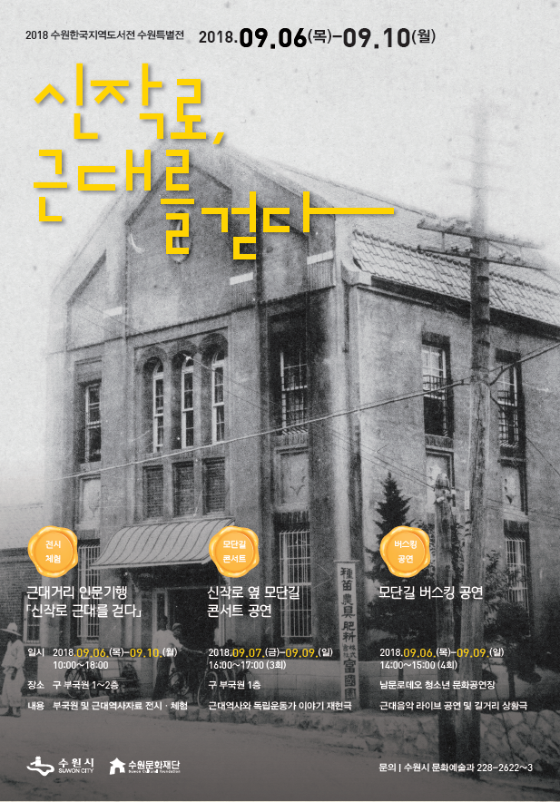 ‘신작로 근대를 걷다’를 주제로 열리는 수원특별전은 수원의 출판문화 역사를 재조명한다. ▲근대역사자료 전시·체험행사 ▲신작로 옆 모단길 콘서트 ▲모단길 버스킹 공연 등 3개의 프로그램이 진행된다.