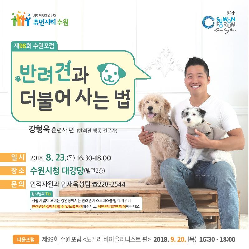 수원시는 오는 23일 오후 4시 30분 수원시청 별관 대강당에서 ‘반려견과 더불어 사는 법’을 주제로 제98회 수원 포럼을 연다. 포럼은 반려견 행동 전문가 강형욱 훈련사의 강연으로 진행된다.