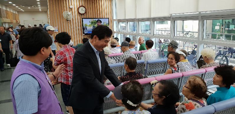 김상돈 의왕시장은 지난 16일 의왕시 사랑채노인복지관을 방문해 어르신들의 건강을 챙기며, 폭염이 지속되고 있는 요즘 건강관리에 특히 유의해 줄 것을 당부했다.