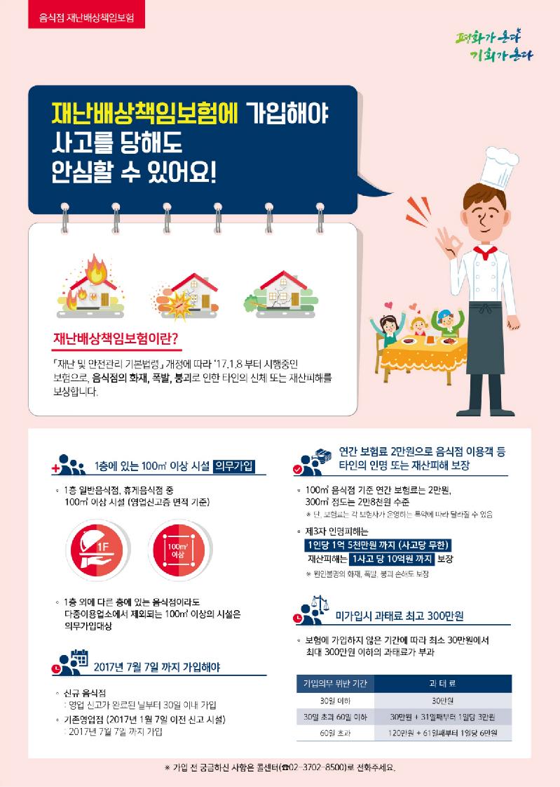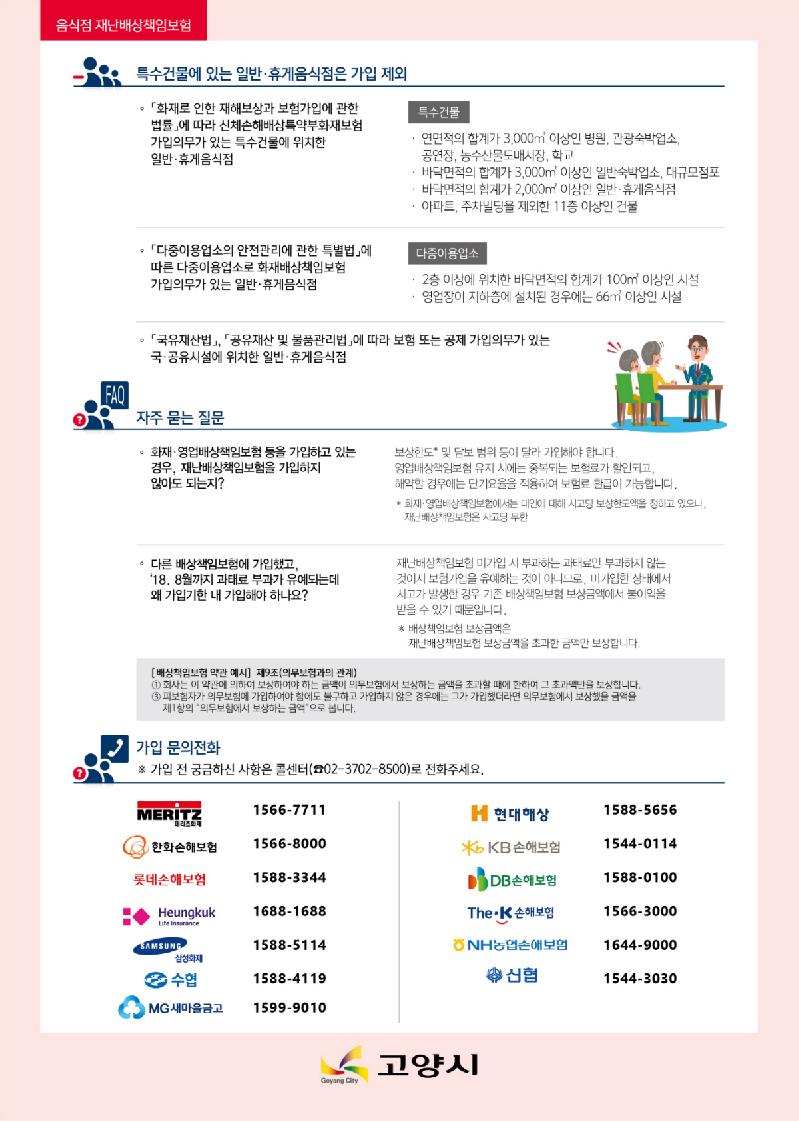 고양시(시장 이재준) 덕양구는 음식점, 숙박업소 등의 재난배상책임보험 의무 가입 유예기간이 오는 8월 31일로 종료됨에 따라 가입을 완료하도록 독려하고 있다.