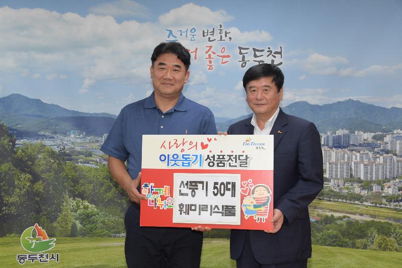 동두천시 소재 훼미리식품(대표 김동환)은 16일 동두천시청을 방문하여 관내 저소득층 다자녀·다가구에 전달해 달라며 선풍기 50대(약 130만원)를 기부했다.