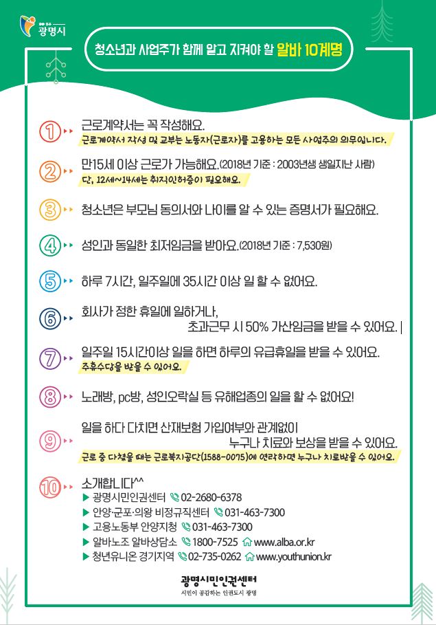 한편 시는 설문지와 함께 ‘청소년과 사업주가 함께 알고 지켜야 할 알바 10계명’ 리플릿을 배포해 노동인권보호를 위해 관련 내용을 적극 안내할 예정이다. 알바 10계명은 △근로계약서는 꼭 작성해요 △만15세 이상 근로가 가능해요 △청소년은 부모님 동의서와 나이를 알 수 있는 증명서가 필요해요 △성인과 동일한 최저임금을 받아요 △하루 7시간, 일주일에 35시간 이상 일 할 수 없어요 △회사가 정한 휴일에 일하거나, 초과근무 시 50% 가산임금을 받을 수 있어요 △일주일 15시간 이상 일을 하면 하루의 유급휴일을 받을 수 있어요 △노래방, pc방, 성인오락실 등 유해업종의 일을 할 수 없어요 △일을 하다 다치면 산재보험 가입여부와 관계없이 누구나 치료와 보상을 받을 수 있어요 △소개합니다(관련기관 전화) 등이다.