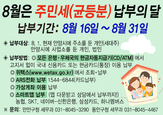 최대호 안양시장은“주민세는 안양지역 발전을 위해 사용되는 소중한 재원인 만큼 시민들이 납부기한 내 납부해 주시길 바란다”고 전했다.