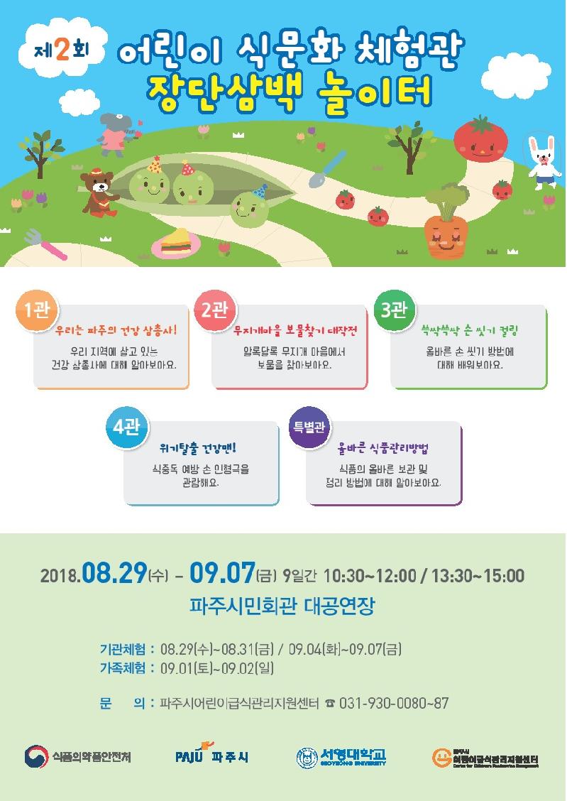 파주시는 오는 29일부터 9월 7일까지 파주시 시민회관 대공연장에서 파주시 급식관리지원센터 등록 급식소 어린이를 대상으로 파주시 어린이 식문화 체험관 ‘장단삼백 놀이터’를 운영한다.