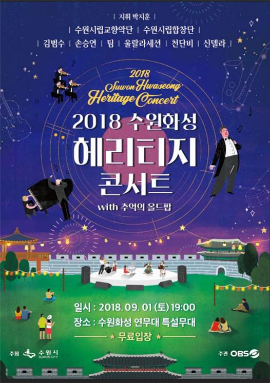 9월의 첫날 저녁 7시 수원화성 연무대 특설무대에서 열리는 ‘수원화성 헤리티지 콘서트 with 추억의 올드팝’에는 수원시립교향악단, 수원시립합창단, 가수 김범수, 손승연, 팀, 울랄라세션, 천단비, 성악가 신델라 등이 출연한다.