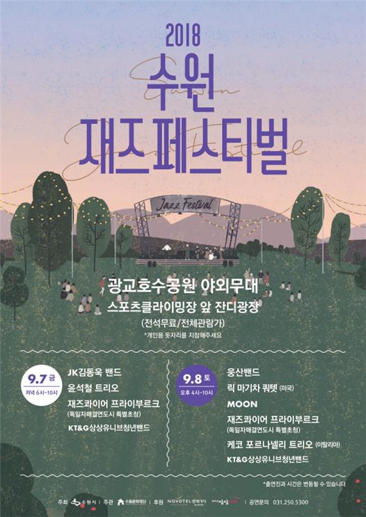 7~8일에는 광교호수공원 스포츠클라이밍장 앞 잔디광장에서 국내외 정상급 재즈 음악가들이 출연하는 2018 ‘수원재즈페스티벌’이 열린다. 7일은 저녁 6시, 8일은 오후 4시에 공연이 시작된다.