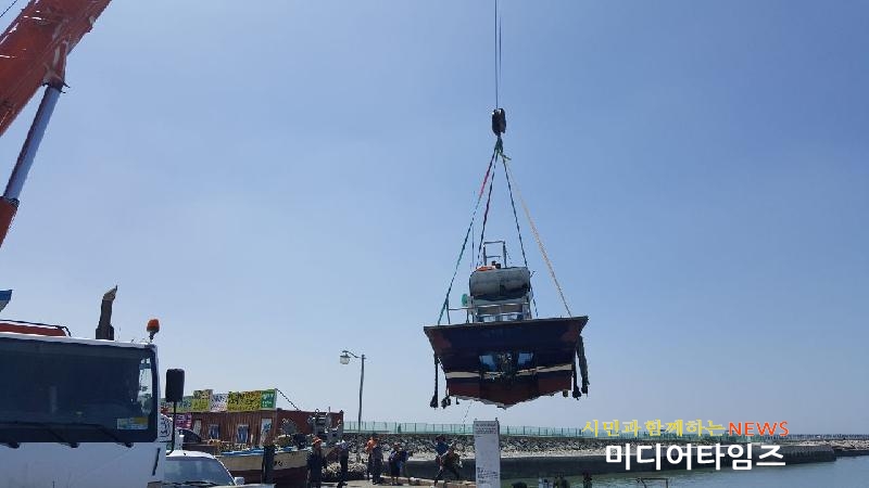 태풍 피해를 대비해 육지로 옮겨지는 선박.