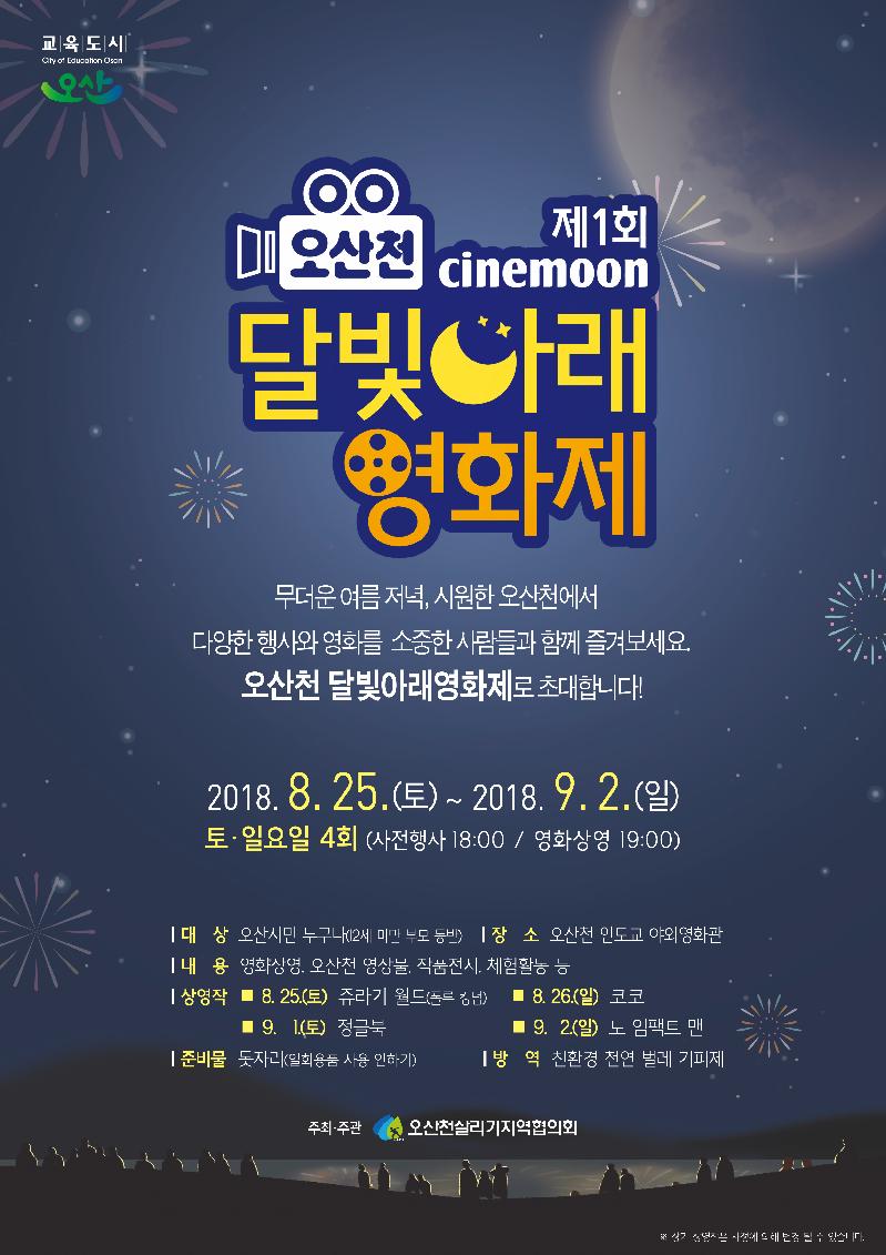 영화제는 오후 6시 오산천 영상물 상영, 작품전시 및 유아동을 대상으로 한 체험활동, 퀴즈맞추기 등 사전행사를 한시간 동안 진행하며, 19시부터는 영화상영이 시작된다. 영화는 1회 ‘쥬라기 월드(폴른킹덤)’를 시작으로 2회는 오산시 어린이의회에서 선정한 애니메이션 ‘코코’, 3회는 모험영화인 ‘정글북’, 4회는 환경영화 ‘노 임팩트 맨’을 상영할 계획이다. ‘오산천 달빛아래 영화제’는 돗자리를 지참하고 입장하면 무료로 야외무대에서 영화를 즐길 수 있다.