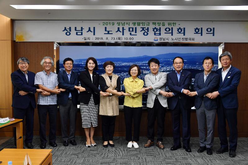 | 23일, 성남시 노사민정협의회가 내년도 생활임금 시급을 1만원으로 의결한 뒤 기념사진을 찍고 있다. |