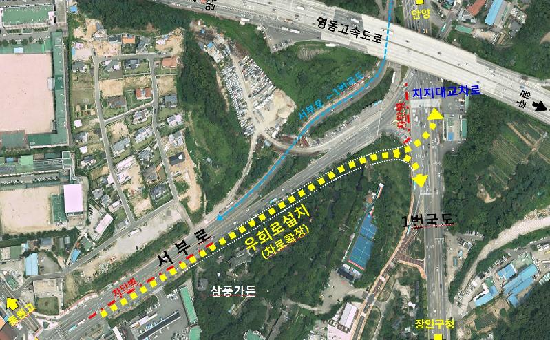다음 달 1일부터 서부로(이목동 삼풍가든 앞)에서 1번 국도 방향 도로 약 400m를 전면 차단하고, 기존도로 우측에 우회로를 만들어 운영된다. 1번 국도에서 서부로 방향으로 진입하는 도로는 변동 없다.