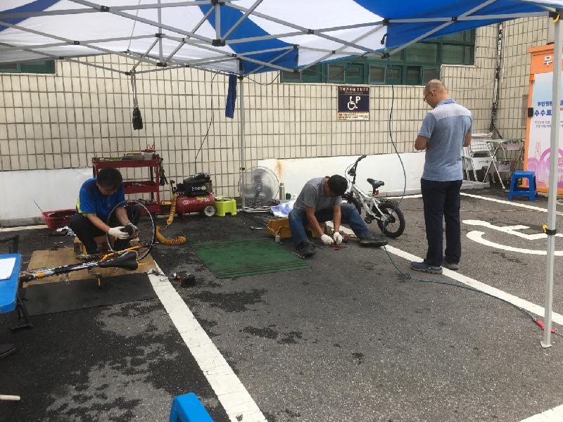 이날 다행히 제19호 태풍(솔릭)의 세력 약화로 수리센터를 정상적으로 운영할 수 있었으며 아침부터 많은 주민들은 그 동안 폭염으로 방치됐던 자전거를 수리센터로 가져와 저렴한 가격으로 수리를 받았다.