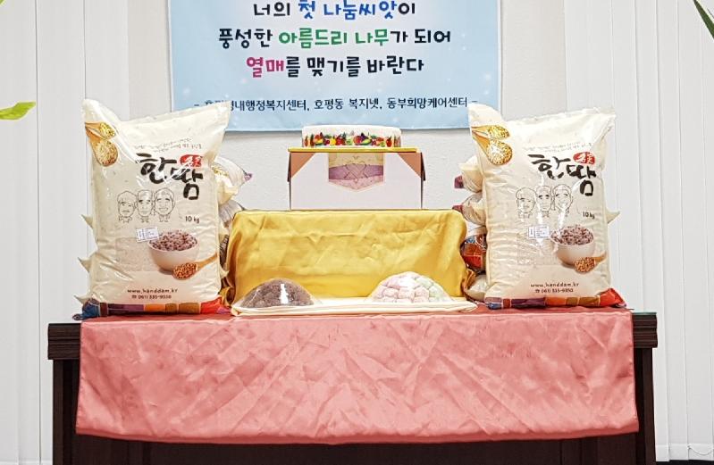 자녀의 돌을 기념하여 돌잔치를 치르는 대신, 그 비용으로 자녀 이름으로 쌀을 기부하고 싶다는 호평동 권OO 부부를 위해 호평동 지역사회보장협의체(위원장 변정환, 이하 복지넷) 위원들이 손수 떡케이크와 돌떡, 아이 사진과 메시지를 담은 현수막을 준비하여 작지만 정성껏 돌상을 차려주며 의미있는 ‘나눔 돌잔치’가 마련됐다.