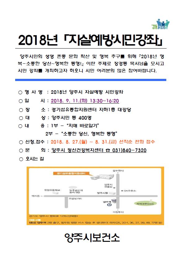 양주시(시장 이성호)는 9월 10일 세계 자살예방의 날과 양주시 정신건강복지센터 개소 10주년을 맞아 ‘2018년 양주시 자살예방 시민강좌’를 오는 9월 11일 경기섬유종합지원센터 대강당에서 개최한다.