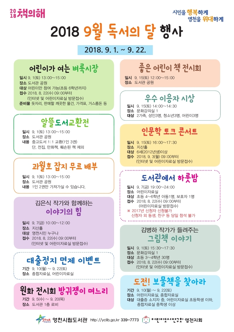 9월 독서의 달을 맞아 최기문 영천시장은 “2018년 책의 해 슬로건(무슨 책 읽어?)처럼 서로 안부를 묻듯 가족, 이웃과 함께 책 이야기를 나누고, 책으로 소통해 우리시가 더욱 더 성장하는 계기가 되기를 바란다”고 말했다.
