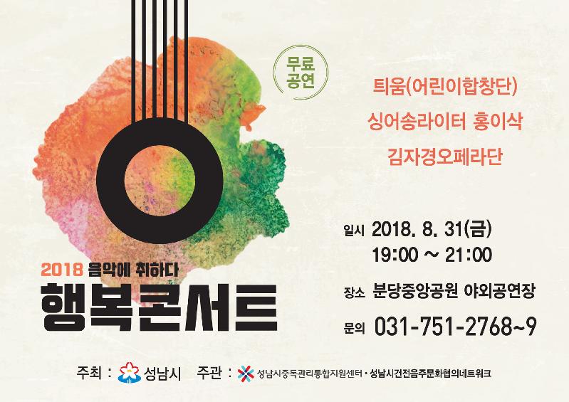 ‘음악에 취하다, 행복 콘서트’를 슬로건으로 하는 이날 행사는 시가 주최하고 성남시 중독관리통합지원센터와 성남시 건전음주문화협의네트워크가 공동 주관해 마련된다.