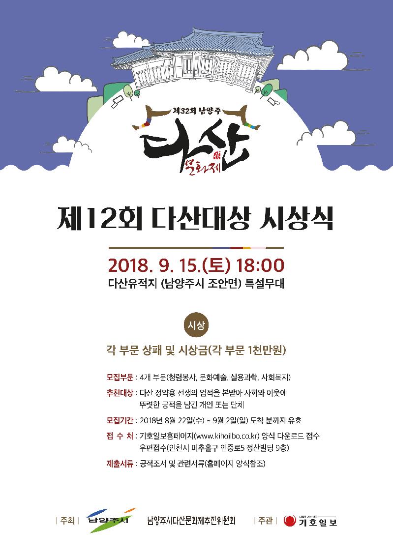 접수는 오는 9월 2일까지 이메일 및 우편을 통해 접수 가능하며, 신청양식은 다산문화제 홈페이지 공지사항에서 받으면 된다.
