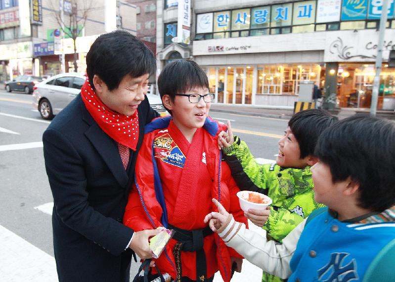 | 나상성 광명시의회 의장은 새마을운동 광명시지회 '온(溫)맵시' 캠페인이 열리고 있는 현장 찾아 새마을지도자들을 격려하고, 수족양말을 시민들에게 전달하고 있다 |