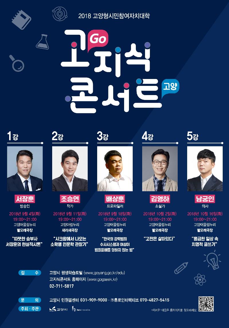 고양시(시장 이재준)는 오는 9월 4일(화) 첫 강연을 시작으로 2018년 고양형 시민참여 자치대학 ‘고지식콘서트(GO! 지식콘서트)’를 개강한다.