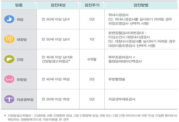 ‘국가 5대 암검진’은 암 조기검진의 인식을 제고하고 암의 조기 발견 및 치료로 암으로 인한 경제적 부담과 사망을 감소시키기 위해 시행되는 국가사업으로 위암, 간암, 대장암, 유방암, 자궁경부암을 대상으로 한다.