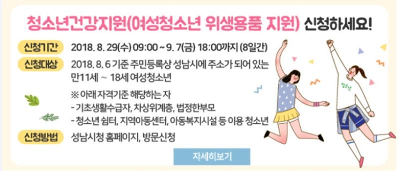 신청 대상자는 만 11세~18세(2000.1.1.~2007.12.31.)의 성남시민 중에서 본인 또는 가구원이 국민기초생활보장법에 따른 생계·의료·주거·교육급여 수급자, 법정 차상위계층, 법이 정한 한부모 가족의 여성 청소년이다.
