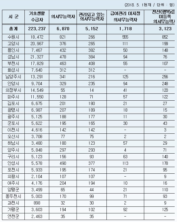 한편, 도는 이번 감사결과 대부분의 시군이 의사무능력자에 대한 복지급여 관리가 허술한 것으로 나타나 각 시군에 시정 조치 명령을 내렸다. 도에 따르면 24개 시군에 거주하는 의사무능력자 1,718명은 급여관리자가 아예 지정조차 되지 않았으며 26개 시군의 3,123명은 사회복지전산시스템(행복e음)에 등록되지 않은 것으로 확인됐다.