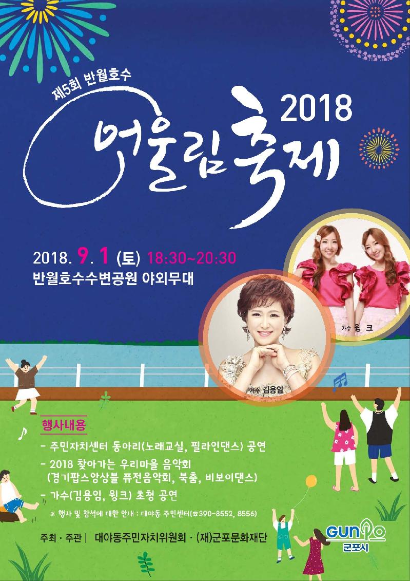 대야동 주민자치위원회(위원장 최주순) 주관으로 실시되는 이번 축제는 주민자치센터 활성화 및 지역주민의 소통과 화합을 위해 마련됐으며, 주민자치센터 프로그램 수강생들이 그 동안 갈고 닦은 노래교실, 필라인댄스 실력을 아낌없이 선보일 예정이다.