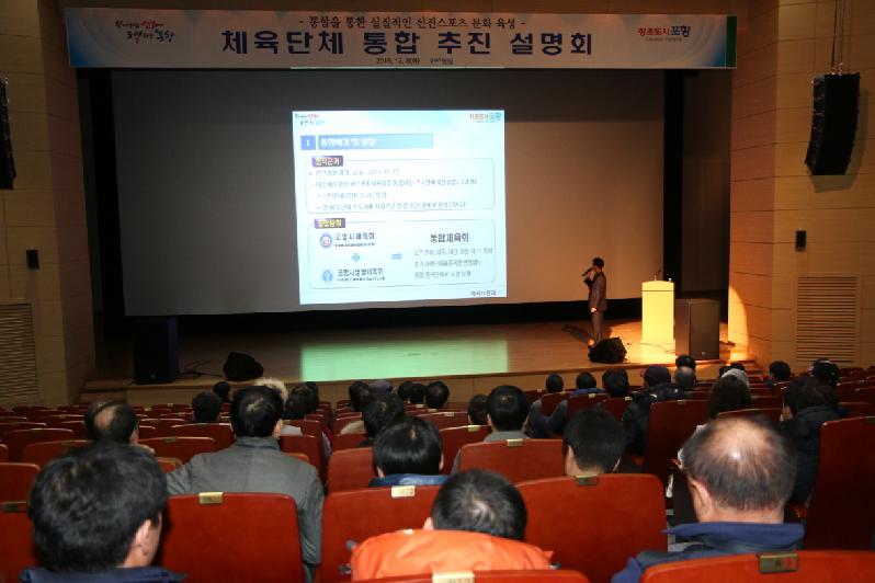 포항시가 8일 평생학습원 덕업관 강당에서 체육단체 임원 및 가맹경기단체, 종목별 연합회 회장단 등 체육관계자 200여명이 참석한 가운데 내년 통합체육회 출범을 앞두고 효율적인 통합 추진을 위한 설명회를 개최했다. 이날 설명회는 정부의 대한체육회(엘리트체육)와 국민생활체육회(생활체육)를 통합하는 국민체육진흥법 개정(2015. 3. 27 공포)에 따른 것으로, 이번 달 구성될 통합추진위원회를 중심으로 자율적인 통합 추진을 통한 시너지(Synergy) 효과를 극대화하여 내년 초 통합체육회 출범에 차질이 없도록 하기위해 마련됐다. 이날은 통합체육회의 효율적 추진을 위해 재정된 ‘통합준비위원회 설치 및 운영에 관한 규정’(문체부 훈령)과 가이드 라인(Guide Line)에 따라 △통합추진위원회 구성 △초대회장 등 임원 선출 △경기가맹단체 및 종목별연합회 통합 △기타 사무국 구성 및 중복행사 처리 등 통합에 필요한 사항과 통합일정에 대해 설명했다. 또한 매년 양 체육단체에서 별도로 개최하던 ‘체육인의 밤’ 행사를 올해는 통합 개최하기로 했다. 이날 참석한 체육관계자는 “양 단체가 통합되면 그동안 중복된 종목별 대회가 통합되는 등 대회 난립으로 인한 문제점이 크게 개선돼 체육단체 운영이 한층 효율성을 띄게 될 것”이라고 말했다. 또, 시 체육지원과 관계자는 “실질적인 선진스포츠 문화 육성을 위한 사회적 흐름에 발맞춰 체육단체 통합을 추진함으로써 엘리트 체육과 생활체육의 상호 연계를 통해 체육발전의 시발점이 될 것”이라고 말했다. 한편 포항시와 체육단체는 지난달 27일 양 체육회의 상임(수석) 부회장 등과 간담회를 갖고, ‘2015 체육인의 밤 행사’의 통합개최를 위한 사전 의견을 나누기도 했다.