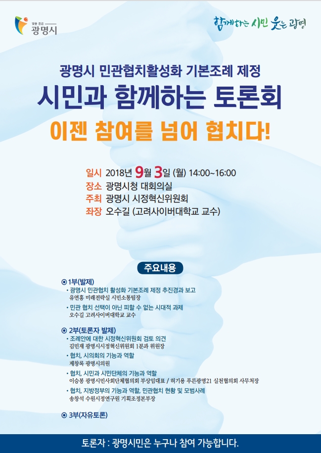 시는 입법예고 전, 더 많은 시민들과 시민사회의 의견을 충분히 수렴하고자 오는 9월 3일(월) 14시에 광명시청 대회의실에서 ‘광명시 민관협치활성화를 위한 기본 조례’ 제정을 위한 시민 참여 토론회를 개최할 예정이다.