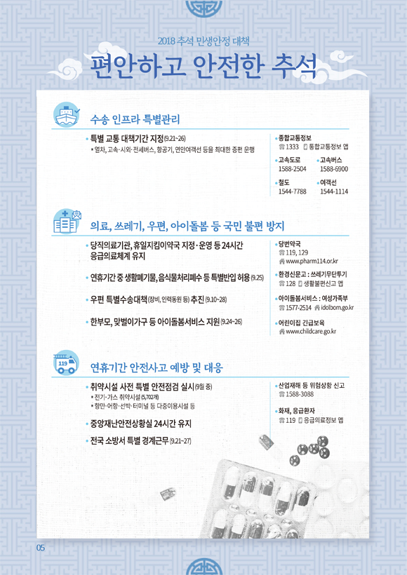 연휴기간 동안 24시간 응급의료체계를 유지하고 우편 특별수송대책과 함께 연휴기간동안 한부모와 맞벌이가구 등 아이돌봄서비스는 정상운영한다.