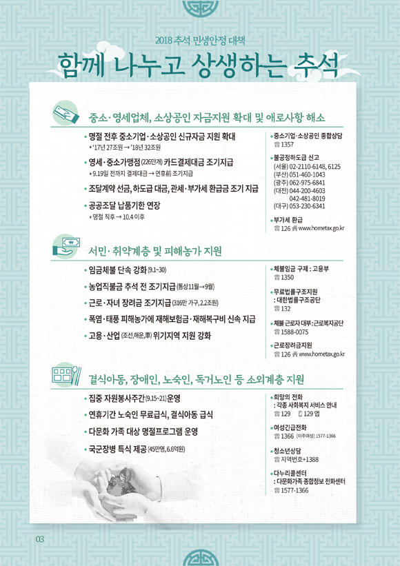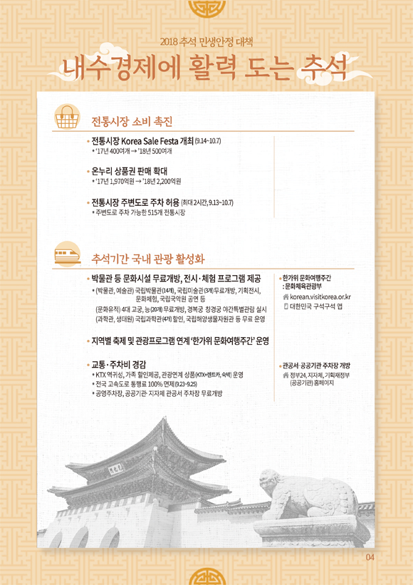 민족최대 명절인 추석연휴(9월 22일~9월 26일)를 맞아 이같은 내용의 ‘2018년 추석 민생안정대책’이 30일 고위당정협의회를 거쳐 확정·발표됐다.