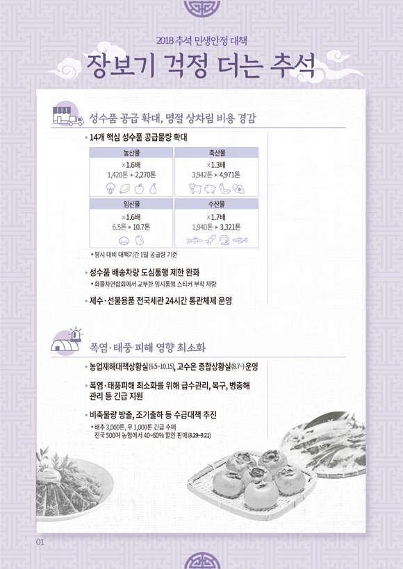 물가 안정과 먹거리 안전 확보에 주력하는 이번 대책은 농산물과 축산물 등 총 14개의 성수품을 중점관리한다. 긴급수매물량 배추 3000톤과 무 1000톤 등을 방출하는 한편 폭염과 관련된 피해 품목을 수급하여 선제적인 가격관리를 추진한다.