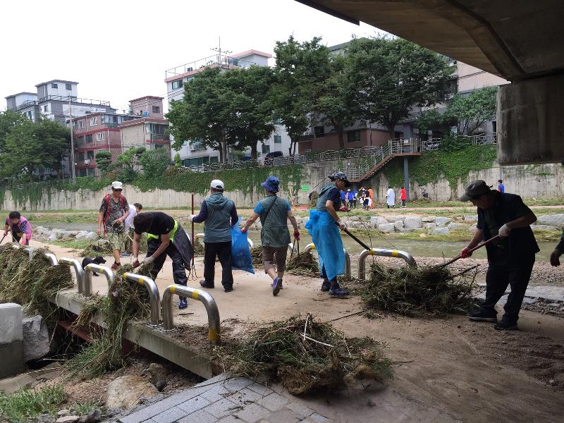 의정부2동(동장 우종모)은 31일 자생단체회원과 공무원 등 110여명이 참여한 가운데 갑작스러운 폭우로 인해 발생한 백석천변 수해 잔재물 제거를 위한 대청소를 실시했다.