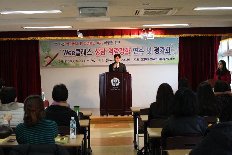 경주교육지원청(교육장 정두락) Wee센터는 12월 9일(월) 9:30~17:00까지 관내 Wee클래스 전문상담인력 35명과 Wee센터 관계자 11명을 대상으로 경주Wee센터 강당에서 2015년 Wee클래스 상담 역량강화 연수(3차) 및 평가회를 실시하였다.
