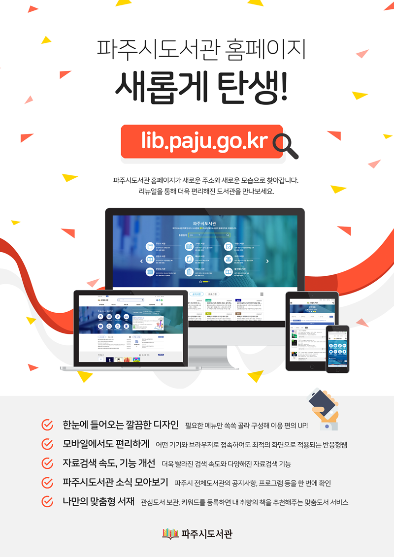 파주시 중앙도서관은 4월부터 시작된 대표 홈페이지(lib.paju.go.kr) 전면 개편 사업을 마치고 운영을 개시했다.