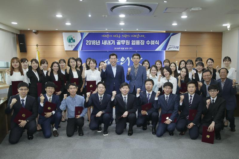 의왕시는 지난 8월 30일 시청소회의실에서 새내기 공직자 33명에 대한 임용장수여식을 열었다. 이들 신규공무원들은 공직자로서 공직생활을 시민의 입장에서 최우선을 시민으로 두고 공직생활을 이어 나갈 것을 다짐하며 행정 일선에 배치돼 업무를 시작했다.