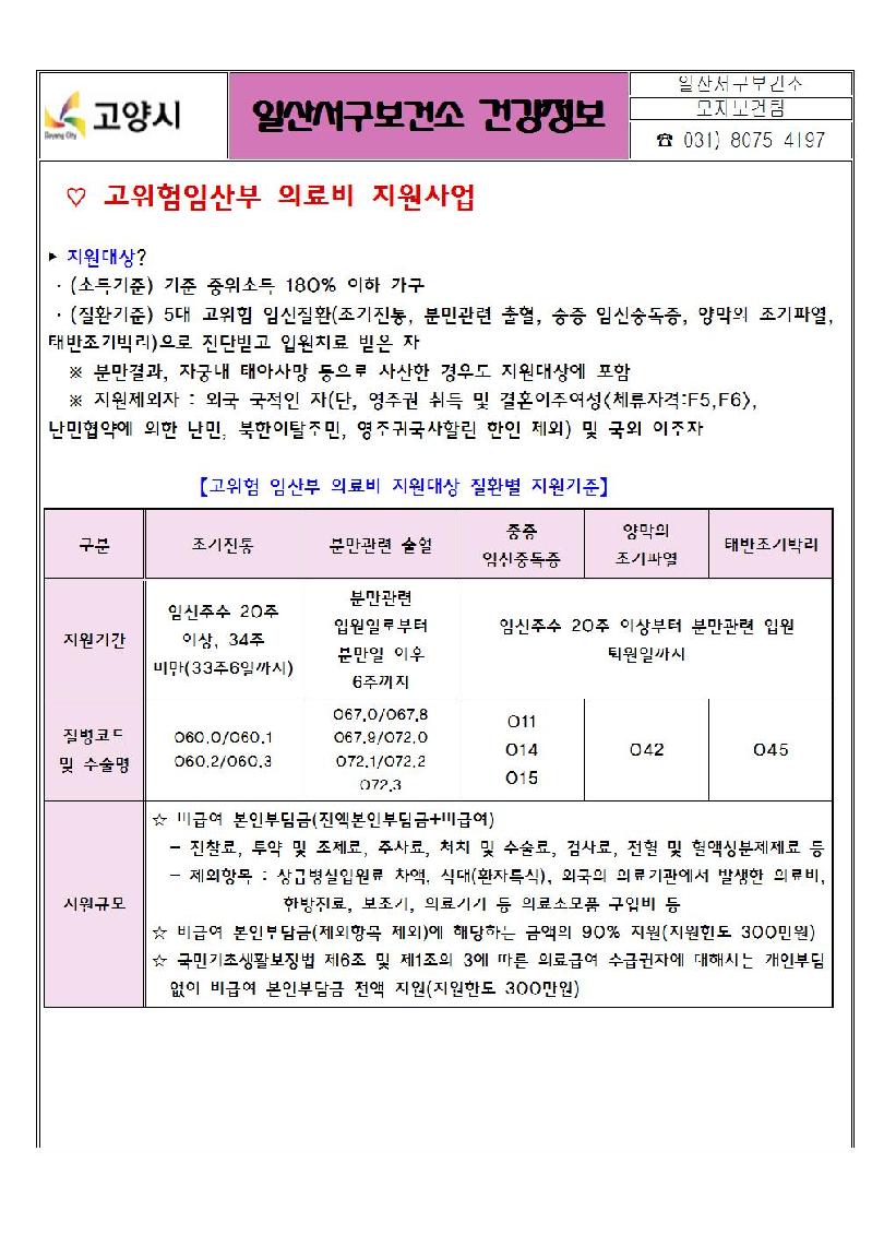 고양시(시장 이재준)는 고위험 임신으로 인한 경제적 부담을 덜어주고 고위험 임산부의 안전한 분만과 태아의 건강을 위해 ‘고위험 임산부 의료비 지원사업’을 실시하고 있다.