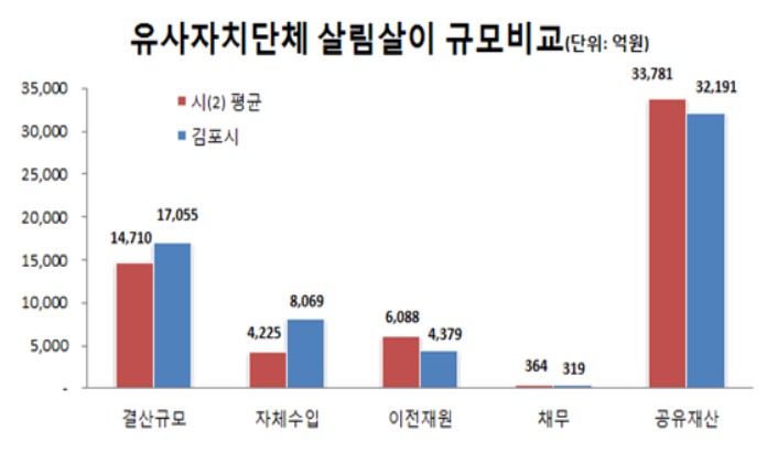 김포시의 2017년 살림규모는 1조 7055억 원으로 전년대비 1241억 원이 증가했으며, 유사 지방정부 평균액 1조 4710억 원보다 2344억 원이 더 많았다.