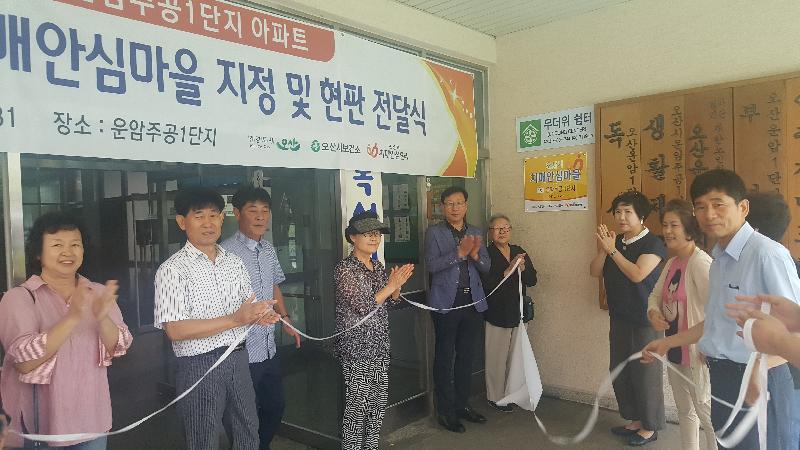 오산시보건소는(왕영애) 지난 31일 운암주공 1단지 경로당을 「제1호 치매안심마을」로 선정하고 치매안심센터장, 노인장애인과장, 대한노인회 오산지회장이 참석한 가운데 「치매안심마을」 현판식을 개최했다.