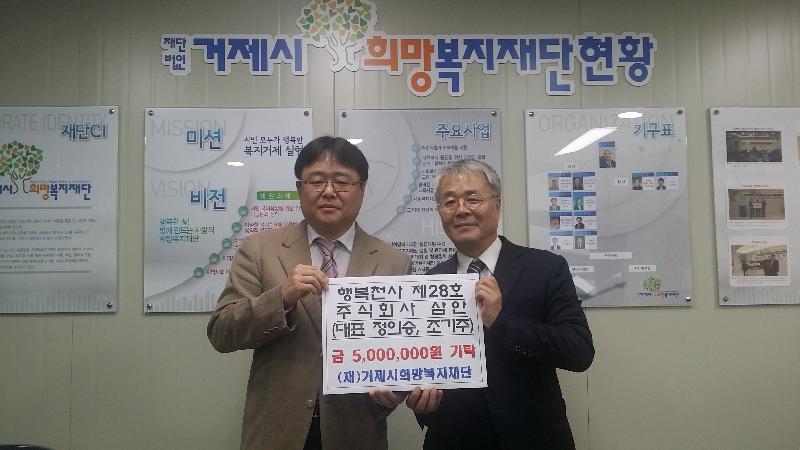 주식회사 삼안(대표 정의승, 조기주)은 지난 8일 오백만원을 (재)거제시희망복지재단(이사장 박동철)에 전달하여 ‘행복천사 28호’가 됐다.