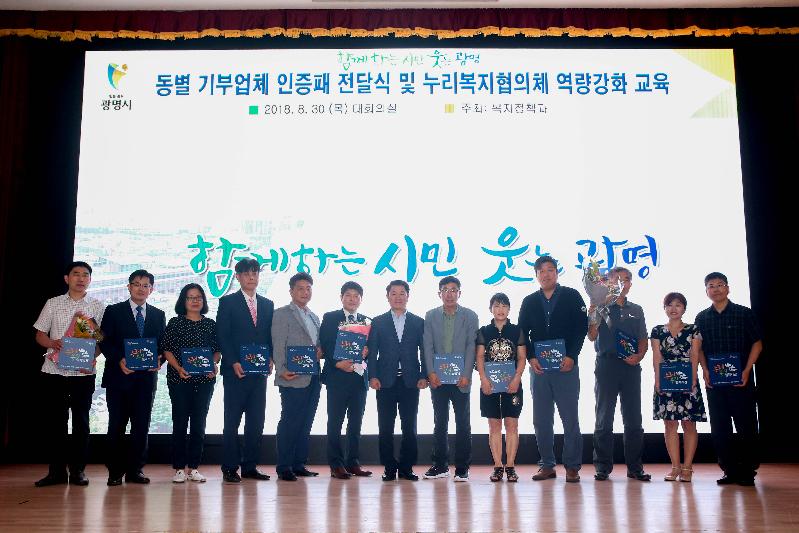 광명시(시장 박승원)는 지난 30일 시청 대회의실에서 저소득층 후원물품 기부업체 인증패 전달식 및 18개동 누리복지협의체 역량강화 교육을 실시했다.