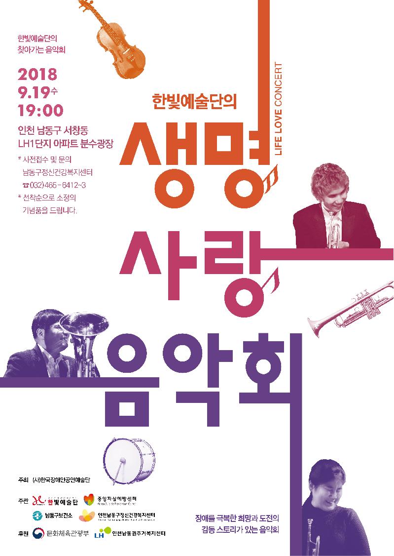 남동구보건소와 남동구정신건강복지센터, 중앙자살예방센터가 함께하는 이번 음악회는 세계 유일의 시각장애인 전문연주단 한빛예술단의 오케스트라 공연으로 해설과 영상을 함께 진행하는 스토리가 있는 음악회로 구성된다.