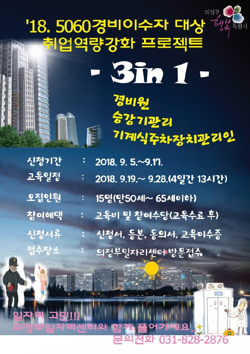 의정부시(시장 안병용)는 취업에 어려움을 겪고 있는 5060 신중년 경비교육 이수자 대상 취업역량강화 프로젝트인 승강기관리교육!, 기계식주차장치 관리인 교육! 인 ❛3in 1❜ 을 9월 19일부터 9월 28일까지 진행한다.