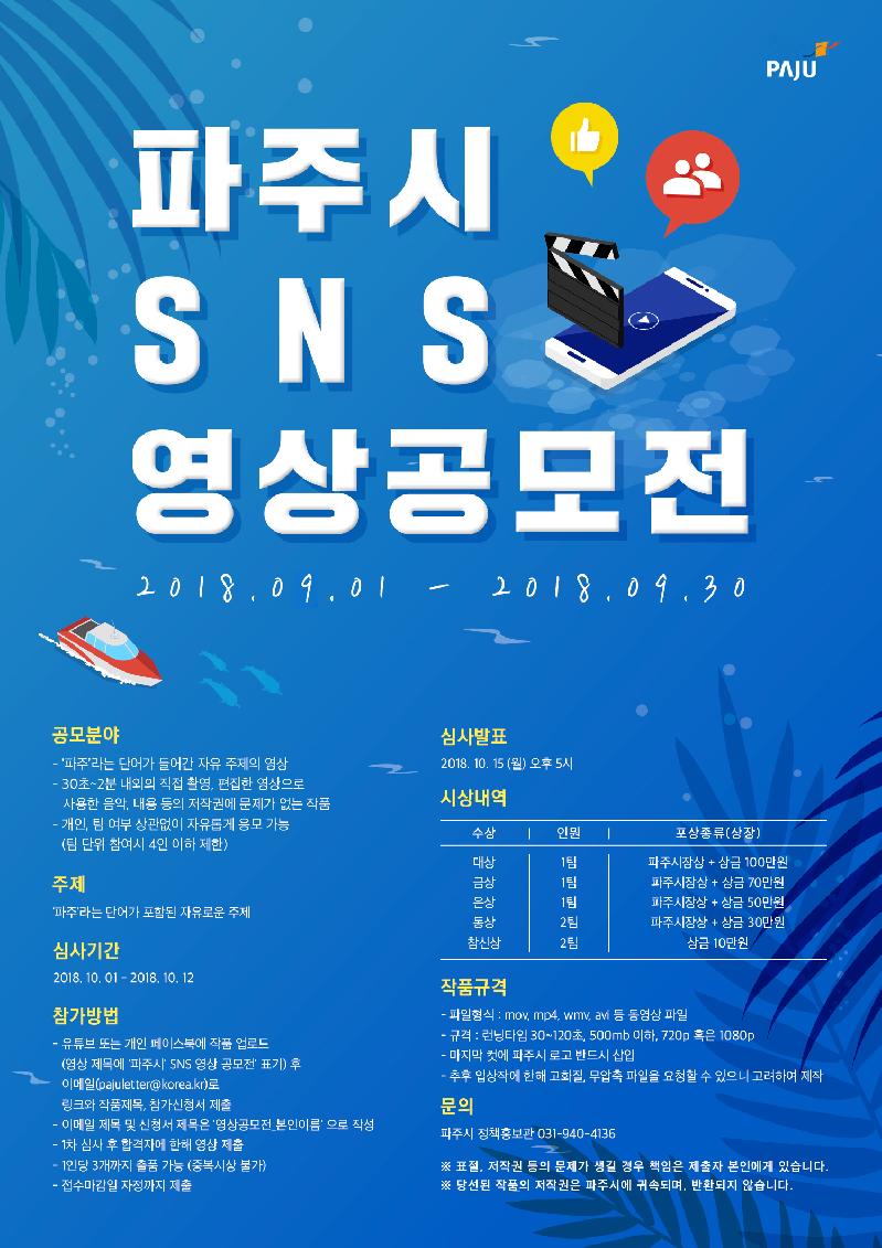 파주시는 지역에 대한 관심과 이해를 높이고 파주를 알릴 수 있는 특색 있고 창의적인 영상콘텐츠를 발굴하기 위해 SNS 영상 공모전을 개최한다.