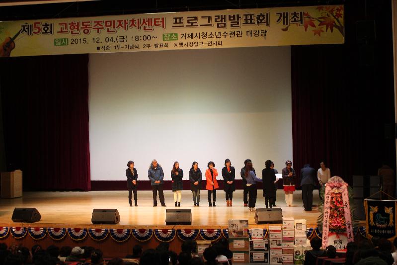 1부 기념식에서는 한 해 동안 투철한 봉사정신으로 동정발전과 주민자치 활성화에 기여한 고현동 주민자치위원(옥성종 감사, 이강석 사무국장)에 대한 시상이 있었으며, 2부 발표회에서는 모듬북, 노래교실, 아코디언 등 9개 프로그램의 수강생들이 다채롭고 열정적인 무대를 선보였다.