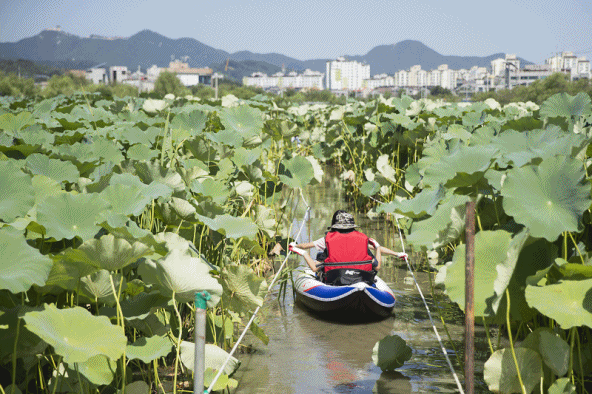 지난 1일 의왕 왕송호수 연꽃습지에서 열린‘2018년 연잎 체험행사’에서 참가자들이 보트탐사를 하며 즐거운 시간을 보내고 있다.