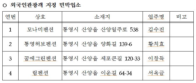 금번에 외국인관광객 지정 민박업소는 4개소로 다음과 같다.