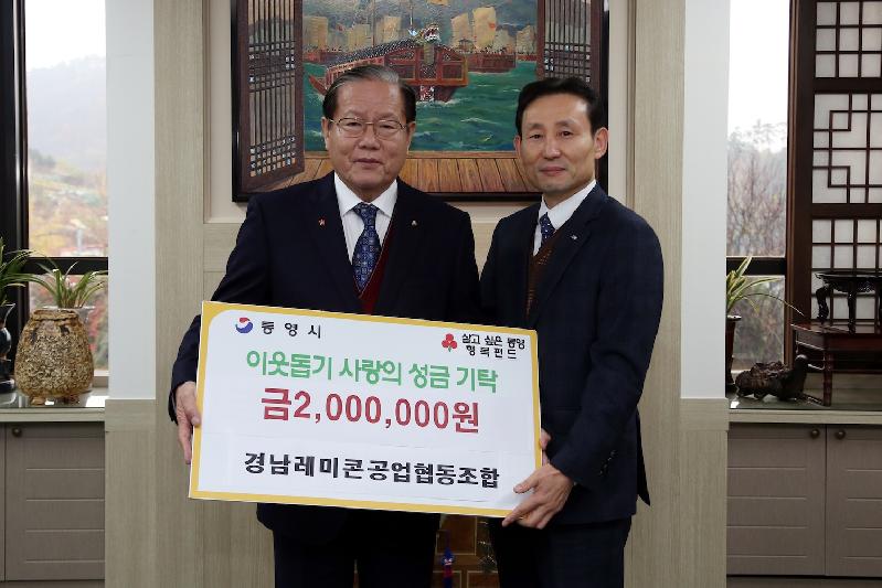 경남레미콘공업협동조합(이사장 진종식)에서 지난 12월 10일 통영시(시장 김동진)가 관내 어려운 이웃들을 위하여 추진하고 있는 행복 나눔 사업인 “살고 싶은 통영 행복펀드”에 불우이웃 돕기 성금 200만원을 기탁했다.