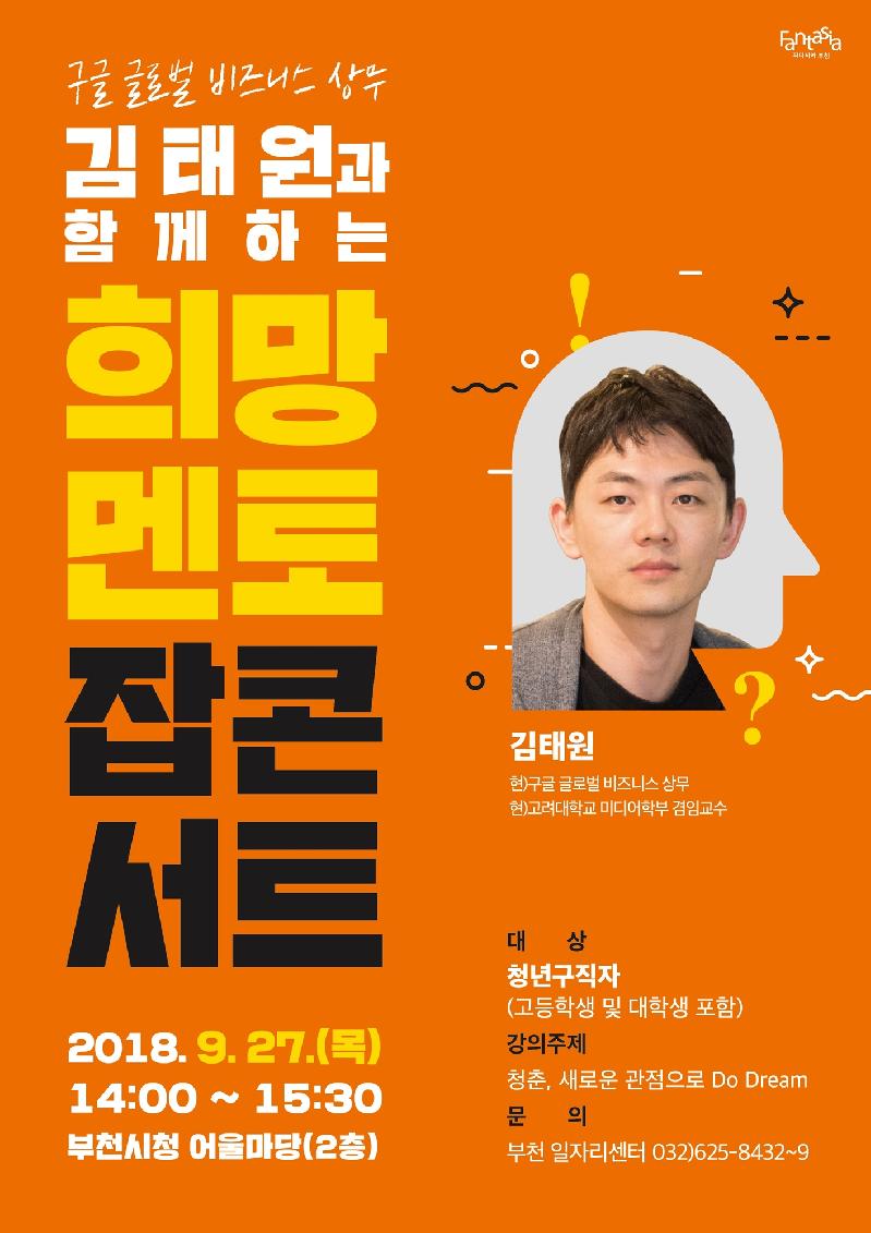 이번 콘서트는 김태원 구글 글로벌 비즈니스 상무가 ‘청춘, 새로운 관점으로 Do Dream’이라는 주제로 진행한다. 노동시장 진입을 앞두고 있는 관내 특성화고 재학생과 대학생을 비롯해 취업에 어려움을 겪고 있는 청춘들에게 열정적인 일상과 인생에 대해 조언과 공감을 이야기할 계획이다.