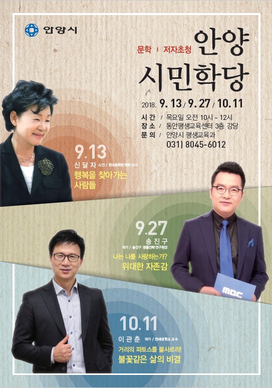 안양시(시장 최대호)는 오는 13일부터 세 번에 걸쳐 둘째·넷째 주 목요일 동안평생교육센터에서 안양시민학당 ‘문학분야’강연을 시작한다.